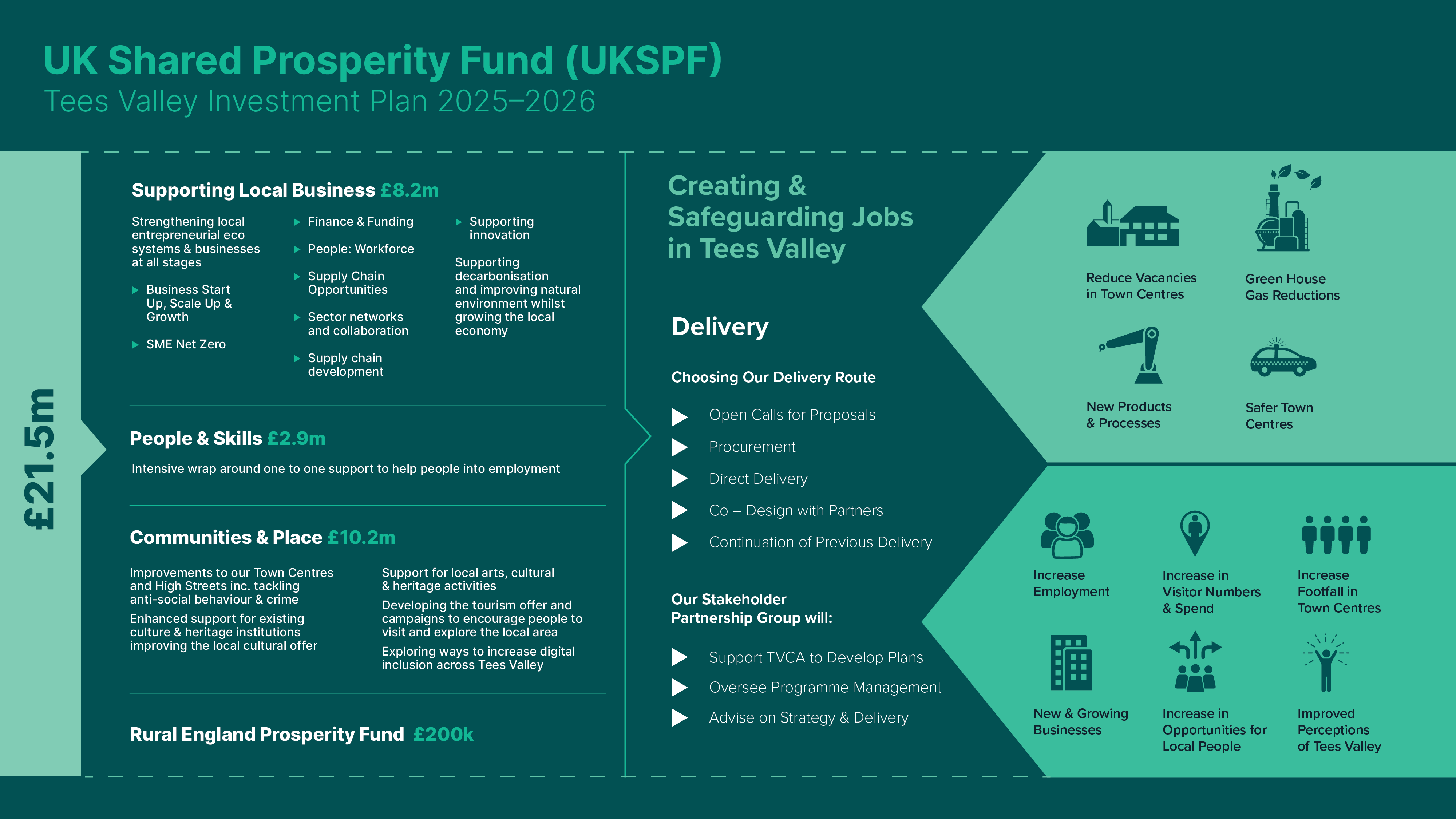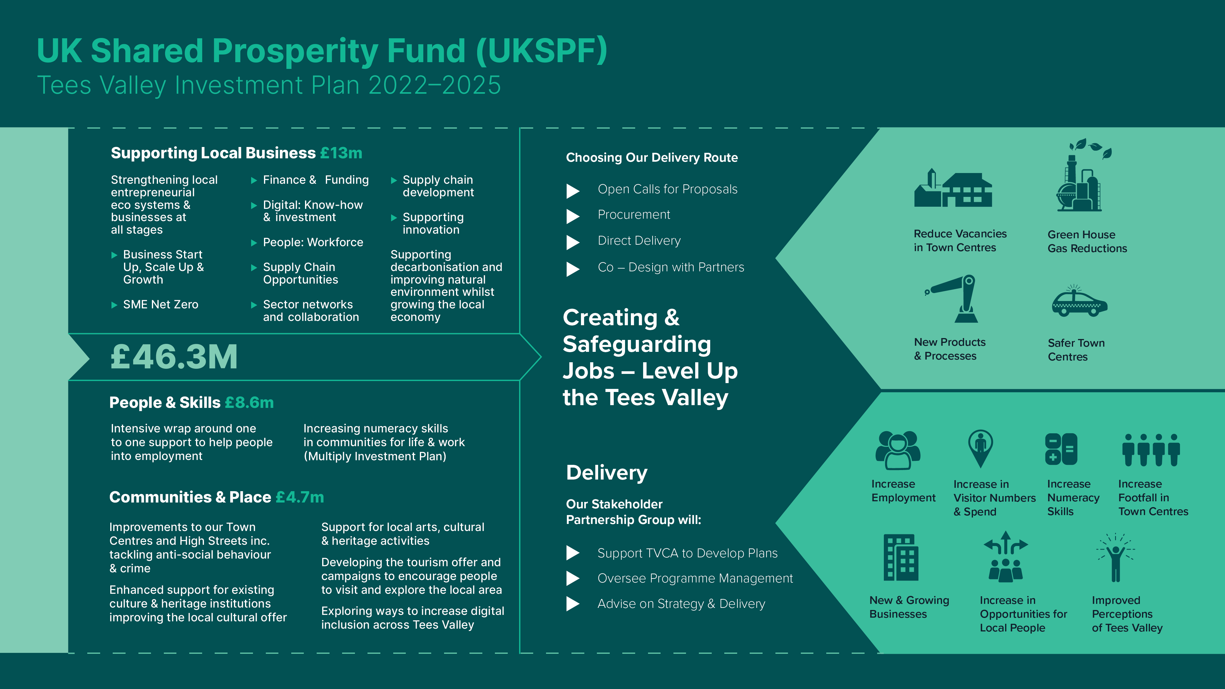 Visit the links below to see the UKSPF Evidence Base in Tees Valley and our investment plans for 2022-25 and 2025/26.