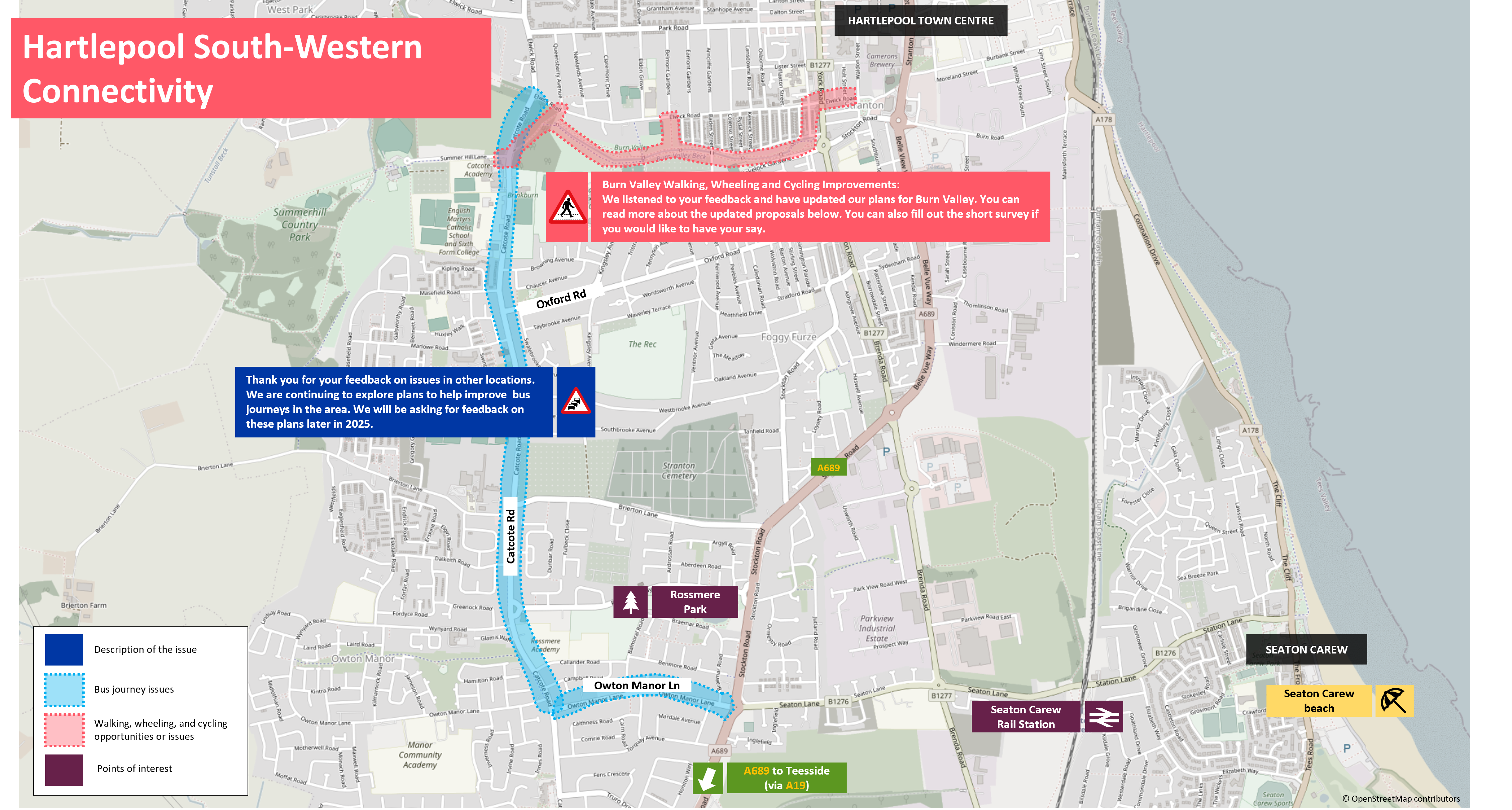 In July and August 2024, we asked for your feedback on our initial proposals to provide better connections into Hartlepool Town Centre from the southwest for people walking, wheeling, and cycling.
